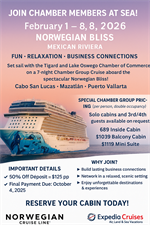 Set sail with the Tigard and Lake Oswego Chamber of Commerce aboard the stunning NCL Norwegian Bliss for a 7-night Chamber Group Cruise filled with: