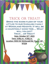 Hello and Welcome to all!! Please join our family for a Spook-tastic time! Bring the kids for some yummy treats, and candy. Hear some great stories from the amazing Residents that make our family and community so warm!